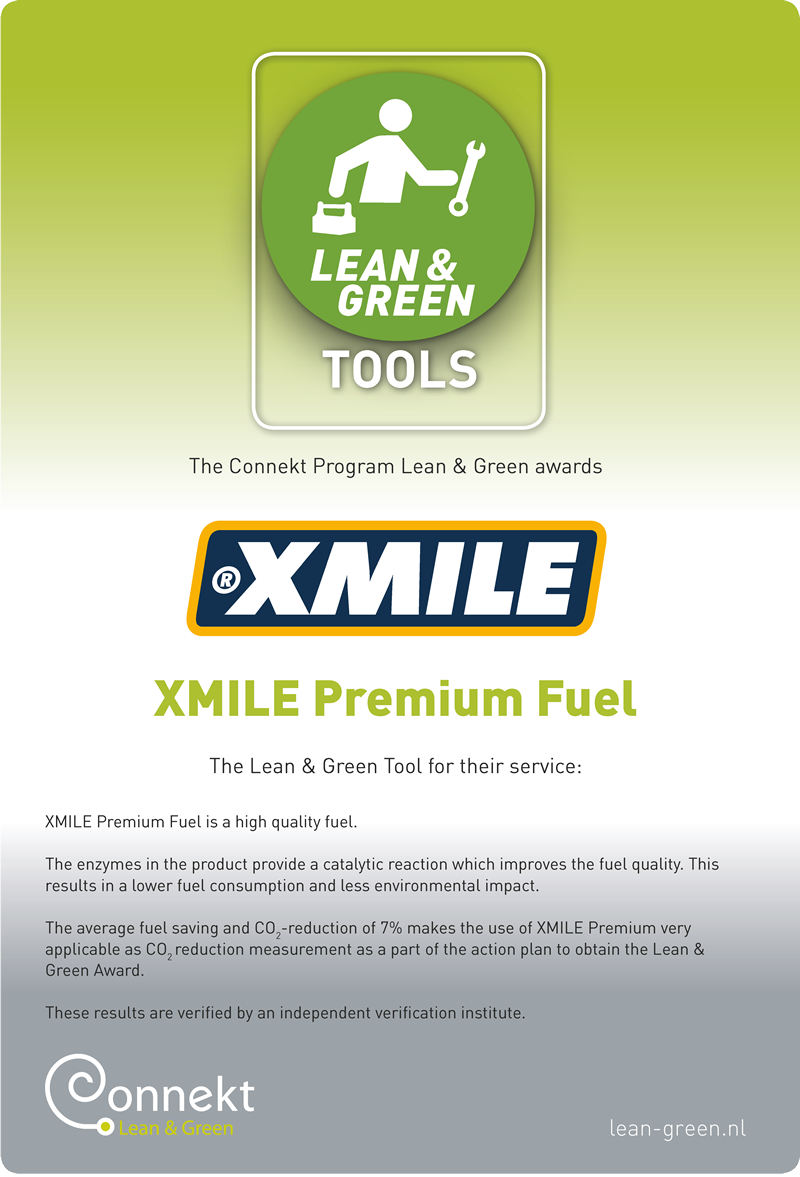 XMILE has been scientifically tested and demonstrably contributes to the reduction of particulate matter, CO and NOx. XMILE is certified as a 7% CO2 reducer and has the predicate 'Lean & Green Tool' .